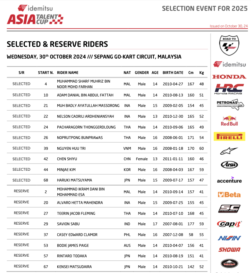 After numerous sessions on track, some names were selected to continue to the next stage until the final decisions and announcements were made following the conclusion of the last outing. 10 riders – nine boys and one girl – were chosen outright, and 8 additional names were selected as reserves, with the 20-strong rider list representing 10 countries: Malaysia, Indonesia, Thailand, Vietnam, China, South Korea, Japan, Australia, Philippines, and India.